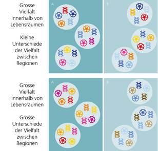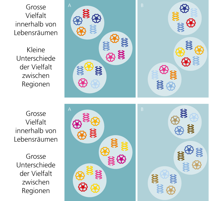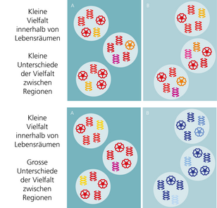 - Zwischen Regionen: Wie sich Lebensgemeinschaften in verschiedenen Regionen in ihrer Artenzusammensetzung und ihren Genen unterscheiden.