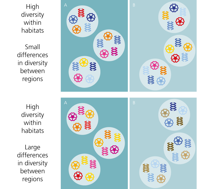 - Between regions: How communities in different regions differ in their species composition and genes.